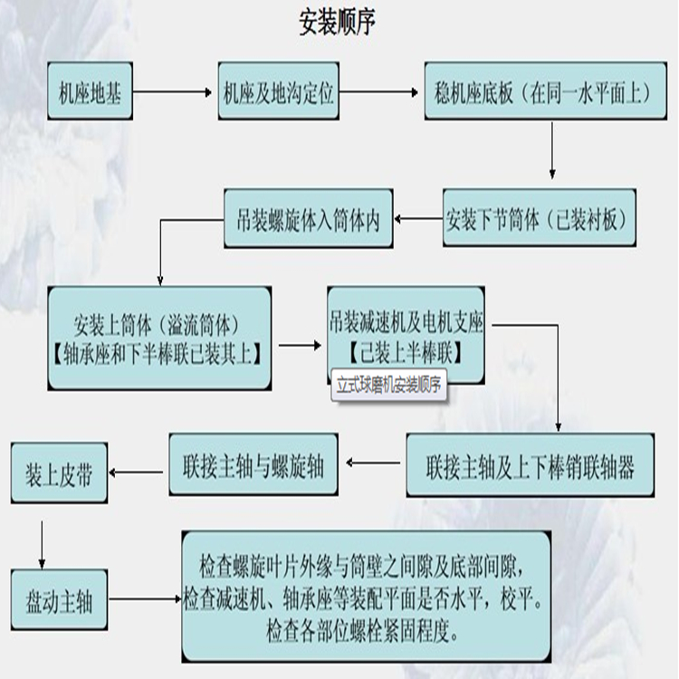 立式螺旋攪拌磨礦機(jī)是我公司研制出來用于進(jìn)行細(xì)磨、超細(xì)磨的設(shè)備,工作效率高,處理量大,具有很多方面的優(yōu)勢,廣泛受到用戶們的認(rèn)可與青睞。那么該設(shè)備對于安裝有哪些方面的要求呢?今天我們就一起來了解下如何正確的安裝該設(shè)備。